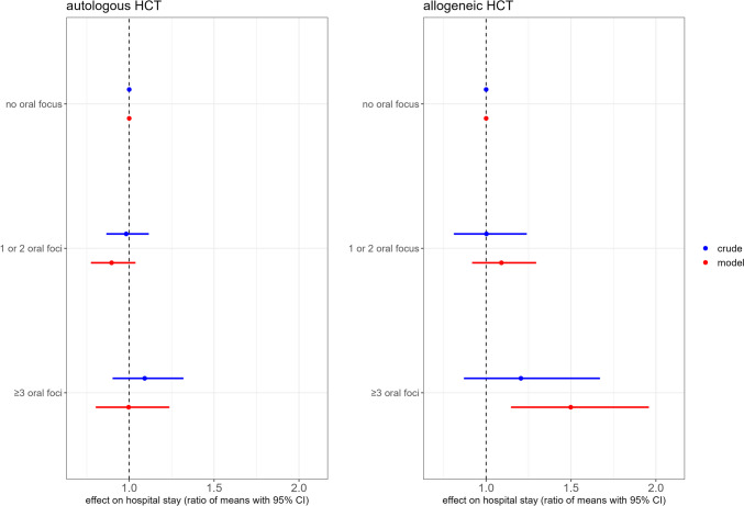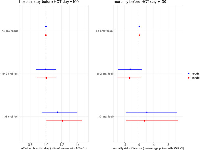 Results: Five hundred patients were included (median age 58 years, 37% female, 56% allogeneic). Four acute foci in two patients remained untreated pre-HCT. Forty-eight percent had at least one untreated chronic focus pre-HCT (mostly furcation radiolucencies and post-endodontic periapical lesions). Mean LOS was 22 days; 20 patients died, and four patients had an oral exacerbation before HCT day + 100. After adjustment for conditioning intensity, age, socioeconomic status and number of teeth, HCT recipients with ≥ 3 foci had five additional days in the hospital compared to those without foci (ratio of means 1.21; 95% CI 1.00 - 1.46). The number of foci was not associated with early post-HCT mortality.