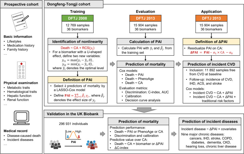 Methods: Using data from the prospective Dongfeng-Tongji (DFTJ) cohort of elderly Chinese, we propose a physiological aging index (PAI) based on 36 routine clinical biomarkers to measure aging progress. We first determined the optimal level of each biomarker by restricted cubic spline Cox models. For biomarkers with a U-shaped relationship with mortality, we derived new variables to model their distinct effects below and above the optimal levels. We defined PAI as a weighted sum of variables predictive of mortality selected by a LASSO Cox model. To measure aging acceleration, we defined ΔPAI as the residual of PAI after regressing on CA. We evaluated the predictive value of ΔPAI on cardiovascular diseases (CVD) in the DFTJ cohort, as well as nine major chronic diseases in the UK Biobank (UKB).
