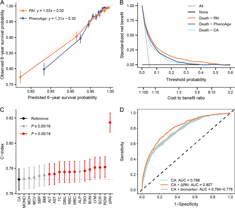 Results: In the DFTJ training set (n = 12,769, median follow-up: 10.38 years), we identified 25 biomarkers with significant nonlinear associations with mortality, of which 11 showed insignificant linear associations. By incorporating nonlinear effects, we selected CA and 17 clinical biomarkers to calculate PAI. In the DFTJ testing set (n = 15,904, 5.87 years), PAI predict mortality with a concordance index (C-index) of 0.816 (95% confidence interval, [0.796, 0.837]), better than CA (C-index = 0.771 [0.755, 0.788]) and PhenoAge (0.799 [0.784, 0.814]). ΔPAI was predictive of incident CVD and its subtypes, independent of traditional risk factors. In the external validation set of UKB (n = 296,931, 12.80 years), PAI achieved a C-index of 0.749 (0.746, 0.752) to predict mortality, remaining better than CA (0.706 [0.702, 0.709]) and PhenoAge (0.743 [0.739, 0.746]). In both DFTJ and UKB, PAI calibrated better than PhenoAge when comparing the predicted and observed survival probabilities. Furthermore, ΔPAI outperformed any single biomarker to predict incident risks of eight age-related chronic diseases.
