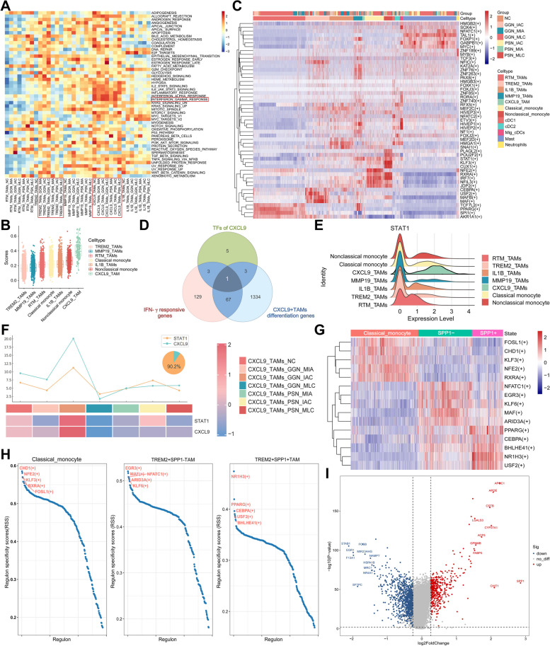 Results: Diverse cellular compositions were observed in the tumor microenvironment (TME) during GGN- and PSN-LUAD invasion and metastasis. Notably, CXCL9 + and TREM2 + tumor-associated macrophages (TAMs) exhibited the most significant enrichment changes. It was found that GGN-LUAD exhibited a stronger immune response than PSN-LUAD, with increased interaction between CXCL9 + TAMs and CD8 + tissue-resident memory T cells during invasion stage (MIA-IAC). Conversely, greater interactions between TREM2 + TAMs and tumor cells were observed in PSN-LUAD during the MLC stage. Additionally, TREM2 + TAMs were found to differentiate into TREM2 + /SPP1 + and TREM2 + /SPP1- TAMs at different stages, which promotes tumor progression. This study also emphasizes that during the transdifferentiation process of GGN- and PSN-LUAD, IFN-γ activates the STAT1 signaling pathway to regulate the activation of CXCL9 + TAMs, and further recruiting CD8 + Trm cells and activating T cells through MHC class I antigen presentation. The role of the IFN-γ/STAT1 pathway in the occurrence and development of LUAD was further validated by animal experiments.