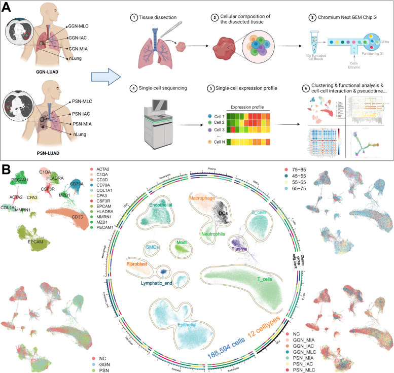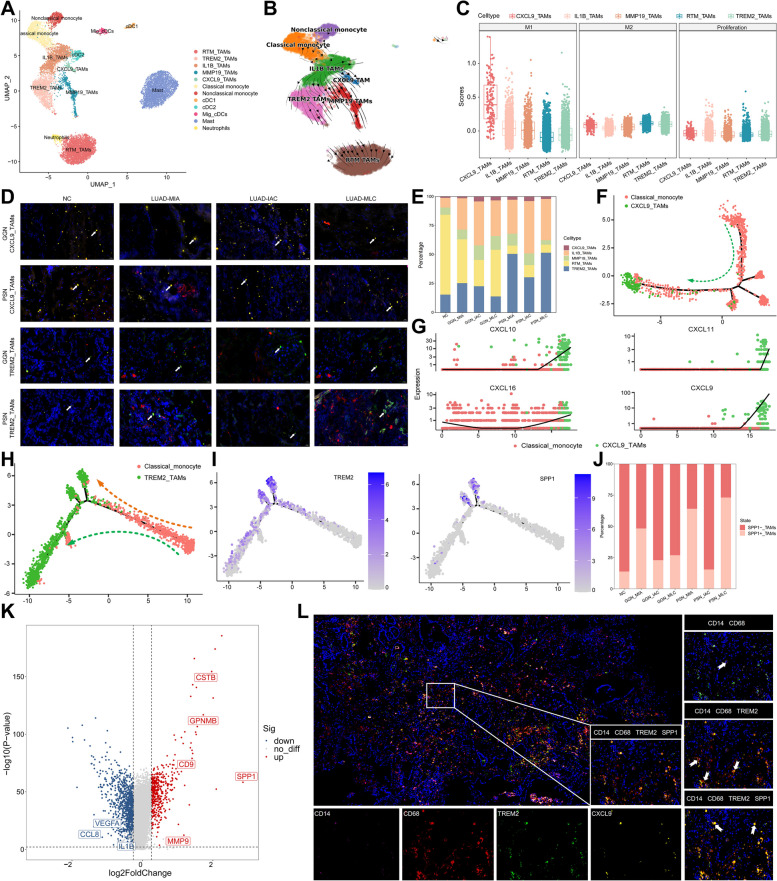 Methods: We performed single-cell RNA sequencing (scRNA-seq) on tumor tissues from eight and seven cases of GGN- and PSN-LUAD, respectively, at different disease stages, including minimally invasive adenocarcinoma (MIA), invasive adenocarcinoma (IAC), and metastatic lung cancer (MLC). Additionally, we analyzed adjacent normal tissues from four cases. Immunohistochemistry, multiplex immunofluorescence, and external scRNA-seq data were employed to confirm the expression of signature genes as well as the distribution patterns of CXCL9 + TAMs and TREM2 + TAMs. A LUAD mouse model was generated using gene editing, organoid culture, and orthotopic transplantation techniques, and comprehensive analyses such as histopathology, RNA sequencing, and Western blotting were performed to validate key pathways.