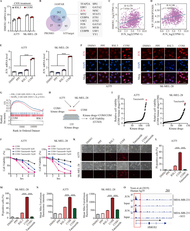 Results: Through large-scale drug screening of cardiovascular drugs, we identified propafenone, an anti-arrhythmia medication, as capable of synergizing with ferroptosis inducers in melanoma. Furthermore, we observed that propafenone, in combination with glutathione peroxidase 4 inhibitor RSL3, collaboratively induces mitochondrial-associated ferroptosis. Mechanistically, propafenone transcriptionally upregulates mitochondrial heme oxygenase 1 through the activation of the Jun N-terminal kinase (JNK)/JUN signaling pathway under RSL3 treatment, leading to overloaded ferrous iron and reactive oxygen species within the mitochondria. In xenograft models, the combination of propafenone and ferroptosis induction led to nearly complete tumor regression and prolonged survival. Consistently, propafenone enhances immunotherapy-induced tumorous ferroptosis and antitumor immunity in tumor-bearing mice. Significantly, patients exhibiting high levels of ferroptosis/JUN/HMOX1 exhibited improved efficacy of immunotherapy and prolonged progression-free survival.