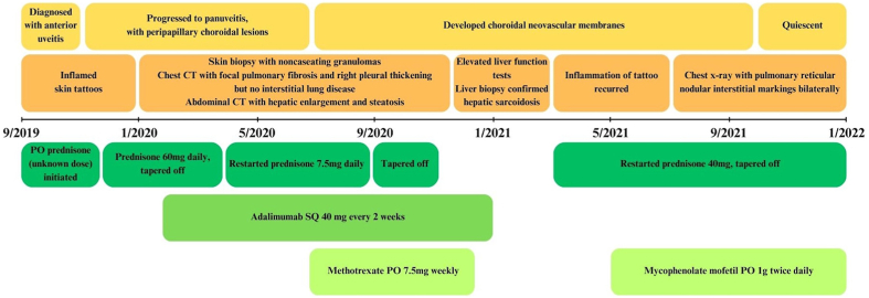 Observations: A 47-year-old male presented with acute anterior uveitis and was found to have simultaneous inflammation of his skin at a tattoo site. Diagnosis of ocular sarcoidosis was confirmed through skin biopsy. Treatment with prednisone and adalimumab was initiated. Despite systemic immunosuppression and control of systemic inflammation, the patient had refractory ocular disease and developed bilateral disc edema and peripapillary choroidal neovascular membranes with subretinal fluid, so oral methotrexate and as-needed intravitreal bevacizumab injections were added. However, the patient manifested hepatic and worsening pulmonary involvement, prompting discontinuation of both methotrexate and adalimumab. Biopsy of the liver later confirmed hepatic sarcoidosis over drug-induced liver injury. Out of precaution for methotrexate-associated hepatic toxicity, mycophenolate mofetil was initiated instead, which then led to resolution of the subretinal fluid and disease quiescence.