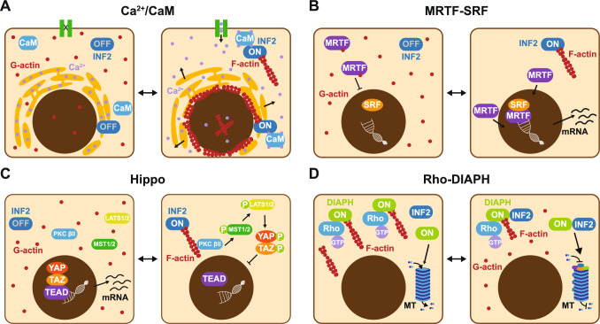 Formins are proteins that catalyze the formation of linear filaments made of actin. INF2, a formin, is crucial for correct vesicular transport, microtubule stability and mitochondrial division. Its activity is regulated by a complex of cyclase-associated protein and lysine-acetylated G-actin (KAc-actin), which helps INF2 adopt an inactive conformation through the association of its N-terminal diaphanous inhibitory domain (DID) with its C-terminal diaphanous autoinhibitory domain. INF2 activation can occur through calmodulin binding, KAc-actin deacetylation, G-actin binding, or association with the Cdc42 GTPase. Mutations in the INF2 DID are linked to focal segmental glomerulosclerosis (FSGS), affecting podocytes, and Charcot-Marie-Tooth disease, which affects Schwann cells and leads to axonal loss. At least 80 pathogenic DID variants of INF2 have been identified, with potential for many more. These mutations disrupt INF2 regulation, leading to excessive actin polymerization. This in turn causes altered intracellular trafficking, abnormal mitochondrial dynamics, and profound transcriptional reprogramming via the MRTF/SRF complex, resulting in mitotic abnormalities and p53-mediated cell death. This sequence of events could be responsible for progressive podocyte loss during glomerular degeneration in FSGS patients. Pharmacological targeting of INF2 or actin polymerization could offer the therapeutic potential to halt the progression of FSGS and improve outcomes for patients with INF2-linked disease.