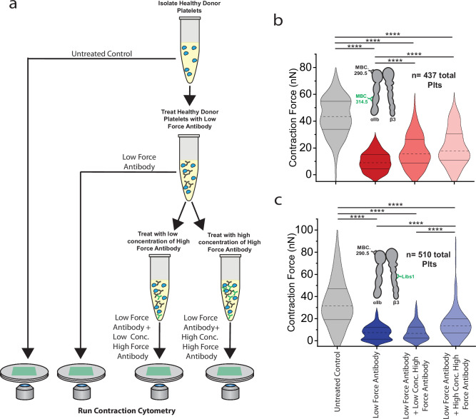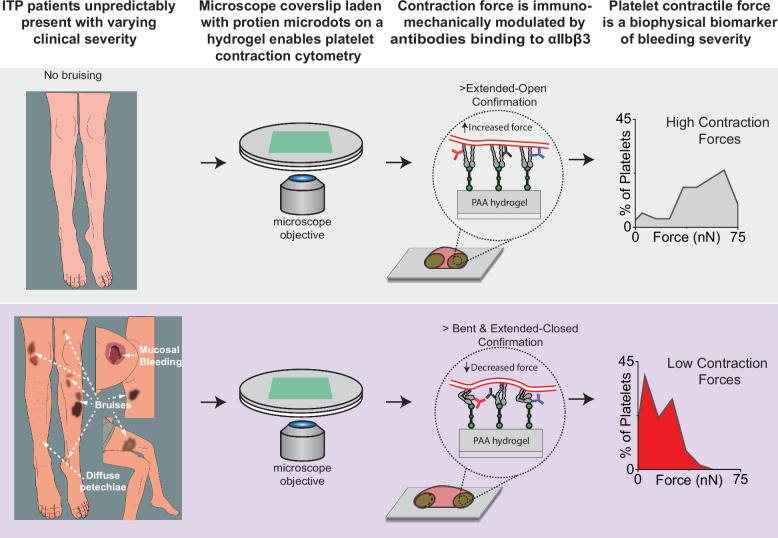 Altered mechanotransduction has been proposed as a putative mechanism for disease pathophysiology, yet evidence remains scarce. Here we introduce a concept we call single cell immuno-mechanical modulation, which links immunology, integrin biology, cellular mechanics, and disease pathophysiology and symptomology. Using a micropatterned hydrogel-laden coverslip compatible with standard fluorescence microscopy, we conduct a clinical mechanobiology study, specifically focusing on immune thrombocytopenia (ITP), an autoantibody-mediated platelet disorder that currently lacks a reliable biomarker for bleeding risk. We discover that in pediatric ITP patients (n = 53), low single platelet contraction force alone is a "physics-based" biomarker of bleeding (92.3% sensitivity, 90% specificity). Mechanistically, autoantibodies and monoclonal antibodies drive increases and decreases of cell force by stabilizing integrins in different conformations depending on the targeted epitope. Hence, immuno-mechanical modulation demonstrates how antibodies may pathologically alter mechanotransduction to cause clinical symptoms and this phenomenon can be leveraged to control cellular mechanics for research, diagnostic, and therapeutic purposes.