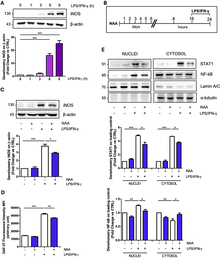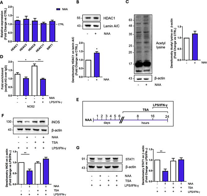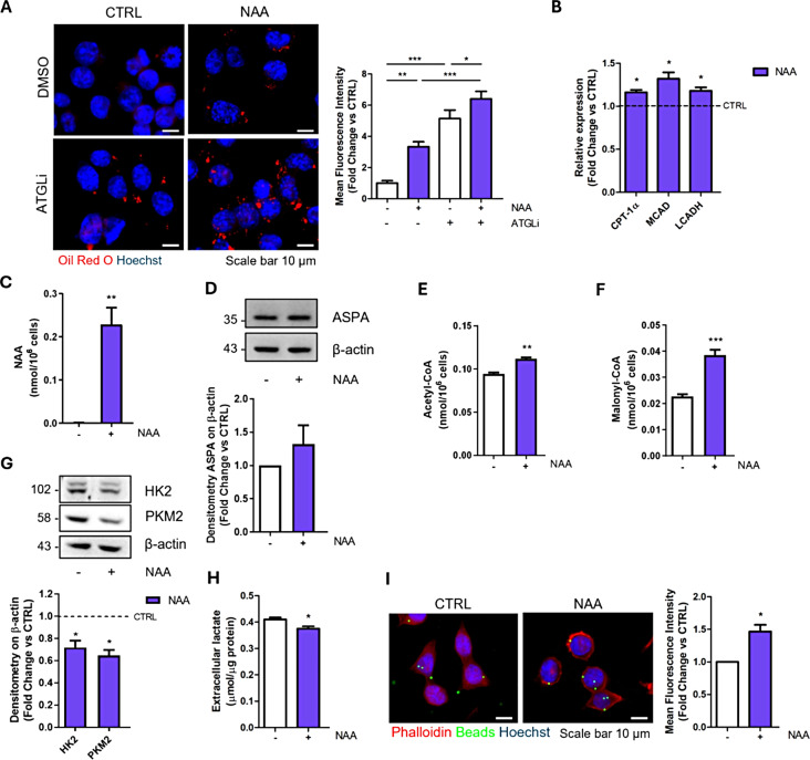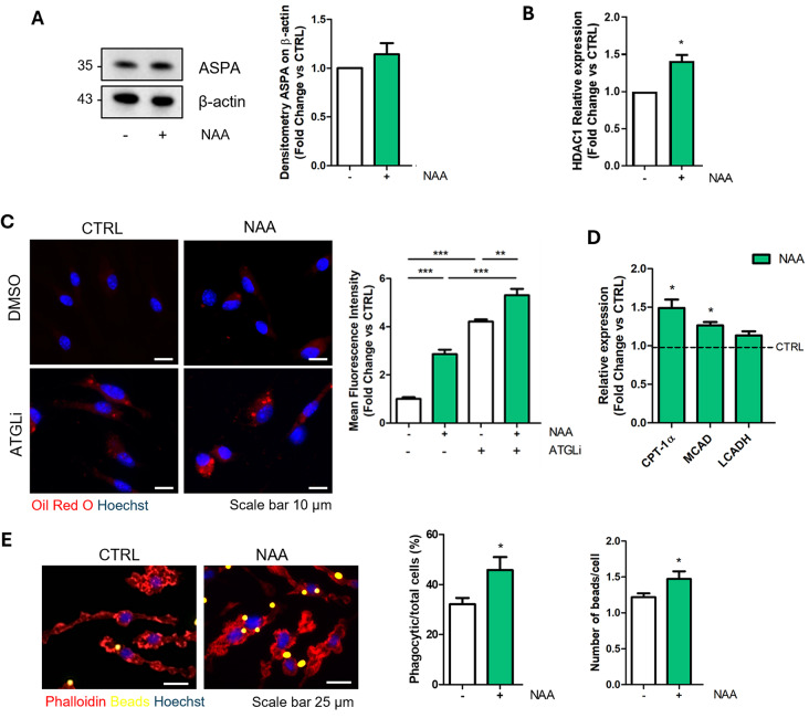 Methods: The murine BV2 microglial cell line and primary microglia were used as experimental models. Cells were treated with exogenous NAA and stimulated with LPS/IFN-γ to reproduce the pro-inflammatory phenomenon. HPLC and immunofluorescence analysis were used to study lipid metabolism following NAA treatment. Automated fluorescence microscopy was used to analyze phagocytic activity. The effects on the pro-inflammatory response were evaluated by analysis of protein/mRNA expression and ChIP assay of typical inflammatory markers.