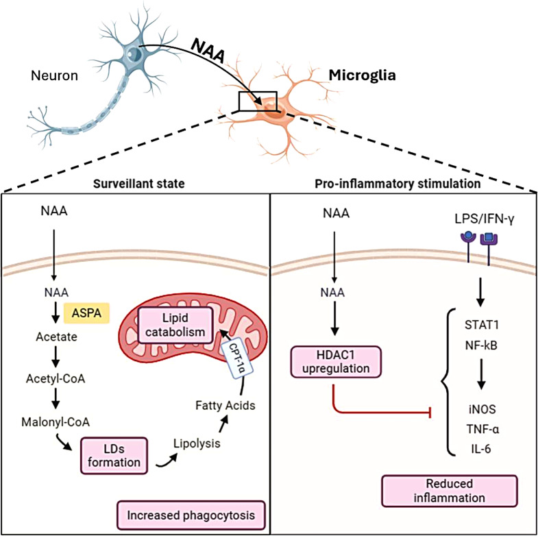 Results: NAA treatment promotes an increase in both lipid synthesis and degradation, and enhances the phagocytic activity of BV2 cells, thus fostering surveillant microglia characteristics. Importantly, NAA decreases the pro-inflammatory state induced by LPS/IFN-γ via the activation of histone deacetylases (HDACs). These findings were validated in primary microglial cells, highlighting the impact on cellular metabolism and inflammatory responses.