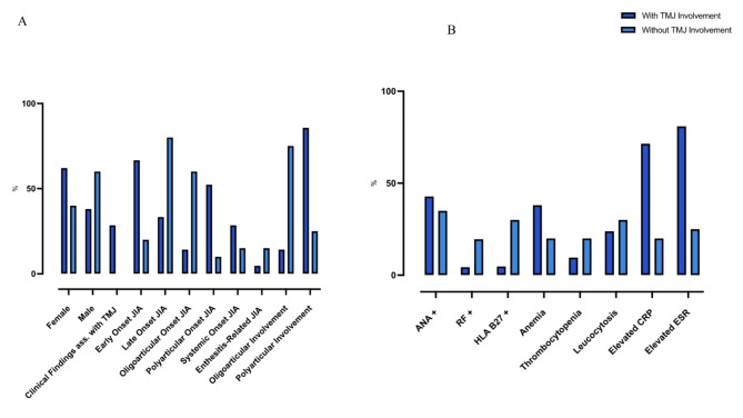 Results: TMJ involvement was detected in 51.2% of the 41 patients included in the study. It was found that 71.5% of the patients with TMJ involvement were asymptomatic and 71.5% of the patients had chronic involvement. When the patients with and without TMJ involvement were compared according to the contrast-enhanced TMJ MRI results; In the patient group with involvement, the polyarticular onset subtype was seen at a higher rate (p = 0.005), the age of onset was earlier (p = 0.003), the disease duration was longer (p = 0.037), more joints were involved (p = 0.005), the ESR values were higher (p = 0.0001), and the treatment compliance and treatment responses of the patients in this group were worse (p = 0.001, p = 0.0001).