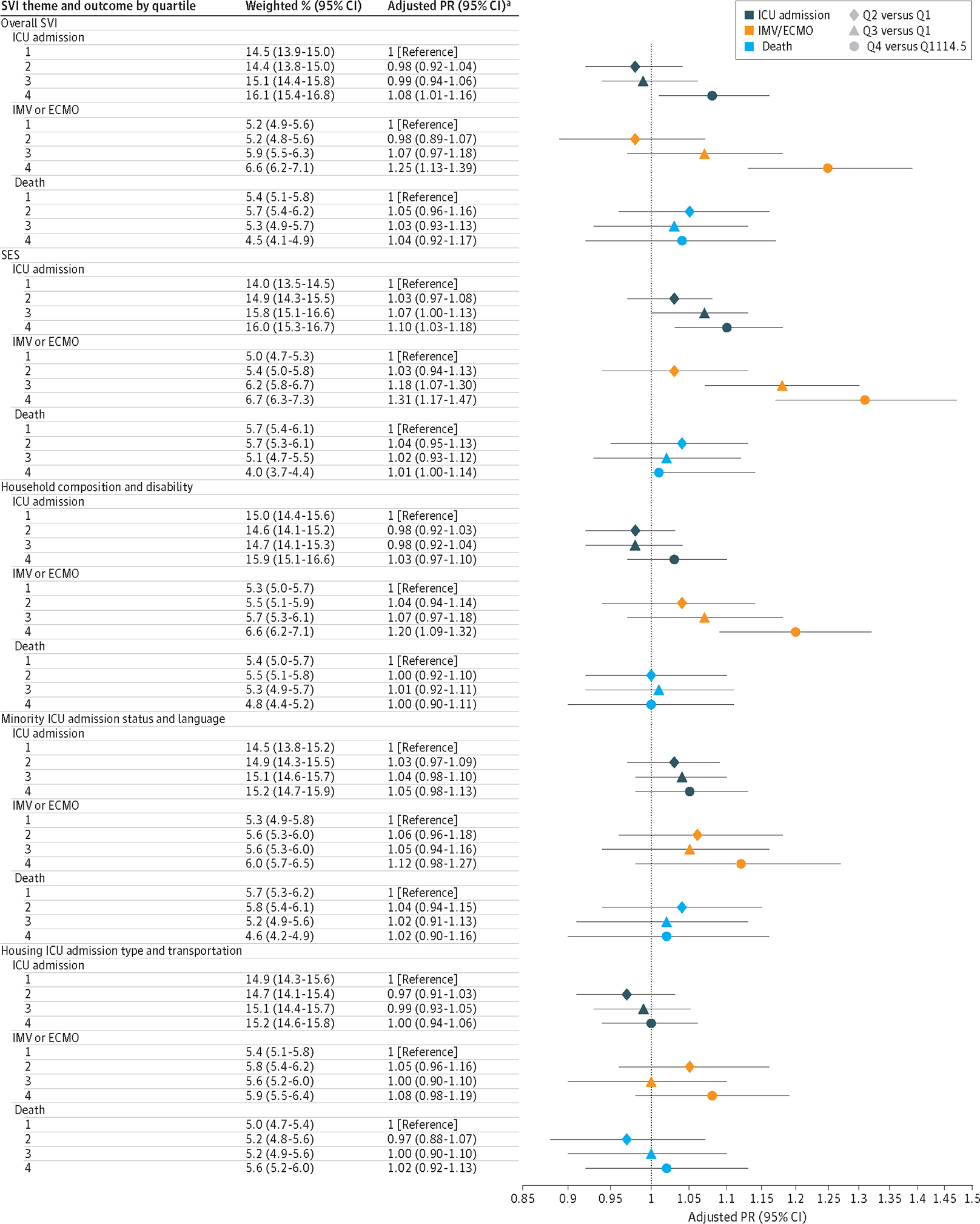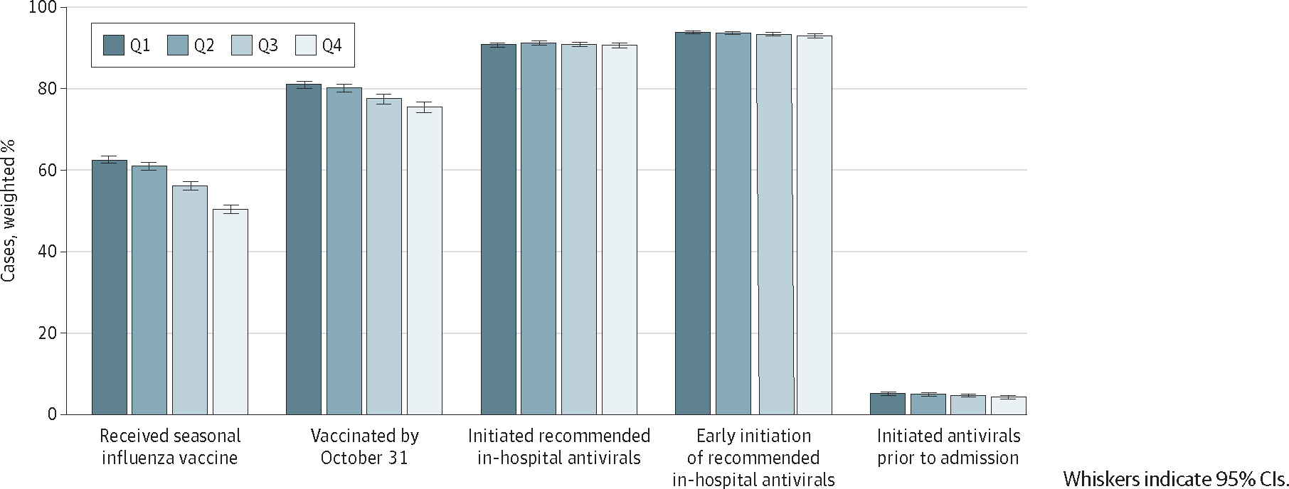 Results: Among 57 964 sampled cases, the median (IQR) age was 71 (58-82) years; 55.5% (95% CI, 51.5%-56.0%) were female; 5.2% (5.0%-5.4%) were Asian or Pacific Islander, 18.3% (95% CI, 18.0%-18.6%) were Black or African American, and 64.6% (95% CI, 64.2%-65.0%) were White; and 6.6% (95% CI, 6.4%-68%) were Hispanic or Latino and 74.7% (95% CI, 74.3%-75.0%) were non-Hispanic or Latino. High social vulnerability was associated with higher prevalence of invasive mechanical ventilation and/or extracorporeal membrane oxygenation support (931 of 13 563 unweighted cases; adjusted prevalence ratio [aPR], 1.25 [95% CI, 1.13-1.39]), primarily due to socioeconomic status (790 of 11 255; aPR, 1.31 [95% CI, 1.17-1.47]) and household composition and disability (773 of 11 256; aPR, 1.20 [95% CI, 1.09-1.32]). Vaccination status, presence of underlying medical conditions, and respiratory symptoms partially mediated all significant associations. As social vulnerability increased, the proportion of patients receiving seasonal influenza vaccination declined (-19.4% relative change across quartiles; P < .001) as did the proportion vaccinated by October 31 (-6.8%; P < .001). No differences based on social vulnerability were found in in-hospital antiviral receipt, but early in-hospital antiviral initiation (-1.0%; P = .01) and prehospital antiviral receipt (-17.3%; P < .001) declined as social vulnerability increased.