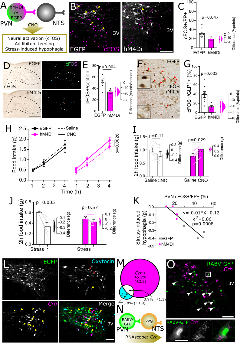 Stress-induced behaviours are driven by complex neural circuits and some neuronal populations concurrently modulate diverse behavioural and physiological responses to stress. Glucagon-like peptide-1 (GLP-1)-producing preproglucagon (PPG) neurons within the lower brainstem caudal nucleus of the solitary tract (cNTS) are particularly sensitive to stressful stimuli and are implicated in multiple physiological and behavioural responses to interoceptive and psychogenic threats. However, the afferent inputs driving stress-induced activation of PPG neurons are largely unknown, and the role of PPG neurons in anxiety-like behaviour is controversial. Through chemogenetic manipulations we reveal that cNTS PPG neurons have the ability to moderately increase anxiety-like behaviours in mice in a sex-dependent manner. Using an intersectional approach, we show that input from the paraventricular nucleus of the hypothalamus (PVN) drives activation of both the cNTS as a whole and PPG neurons in particular in response to acute restraint stress, but that while this input is rich in corticotropin-releasing hormone (CRH), PPG neurons do not express significant levels of receptors for CRH and are not activated following lateral ventricle delivery of CRH. Finally, we demonstrate that cNTS-projecting PVN neurons are necessary for the ability of restraint stress to suppress food intake in male mice. Our findings reveal sex differences in behavioural responses to PPG neural activation and highlight a hypothalamic-brainstem pathway in stress-induced hypophagia.