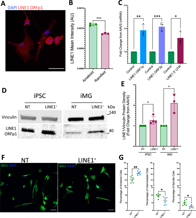 Aberrant activity of the retrotransposable element long interspersed nuclear element-1 (LINE-1) has been hypothesized to contribute to cellular dysfunction in age-related disorders, including late-onset Alzheimer's disease (LOAD). However, whether LINE-1 is differentially expressed in cell types of the LOAD brain, and whether these changes contribute to disease pathology is largely unknown. Here, we examined patterns of LINE-1 expression across neurons, astrocytes, oligodendrocytes, and microglia in human postmortem prefrontal cortex tissue from LOAD patients and cognitively normal, age-matched controls. We report elevated immunoreactivity of the open reading frame 1 protein (ORF1p) encoded by LINE-1 in microglia from LOAD patients and find that this immunoreactivity correlates positively with disease-associated microglial morphology. In human iPSC-derived microglia (iMG), we found that CRISPR-mediated transcriptional activation of LINE-1 drives changes in microglial morphology and cytokine secretion and impairs the phagocytosis of amyloid beta (Aβ). We also find LINE-1 upregulation in iMG induces transcriptomic changes genes associated with antigen presentation and lipid metabolism as well as impacting the expression of many AD-relevant genes. Our data posit that heightened LINE-1 expression may trigger microglial dysregulation in LOAD and that these changes may contribute to disease pathogenesis, suggesting a central role for LINE-1 activity in human LOAD.