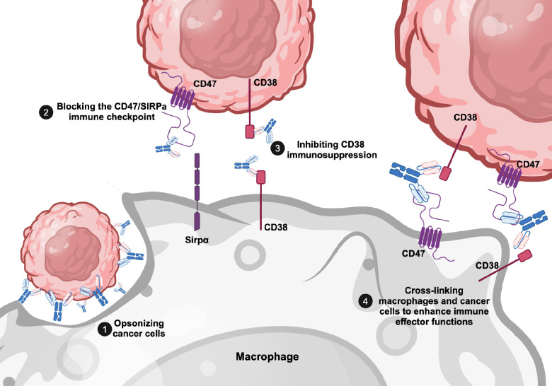 Macrophages are critical effectors of antibody therapies for lymphoma, but the best targets for this purpose remain unknown. Here, we sought to define a comprehensive repertoire of cell surface antigens that can be targeted to stimulate macrophage-mediated destruction of B-cell lymphoma. We developed a high-throughput assay to screen hundreds of antibodies for their ability to provoke macrophages to attack B-cell lymphoma cells. Across both mouse and human systems, we identified multiple unappreciated targets of opsonization as well as putative immune checkpoints. We used this information to engineer a compendium of 156 bispecific antibodies, and we identified dozens of bispecifics that dramatically stimulate macrophage-mediated cytotoxicity of lymphoma cells. Among these, a bispecific comprising a SIRPα decoy domain and a CD38-targeting arm (WTa2d1×CD38) exhibited maximal efficacy while minimizing the risk of hematologic toxicity. This bispecific stimulated robust anti-tumor responses in multiple xenograft models of aggressive B-cell lymphoma. Our approach can be directly applied to other cancers to rapidly discover bispecific antibodies that leverage anti-tumor responses by macrophages or other innate immune cells.