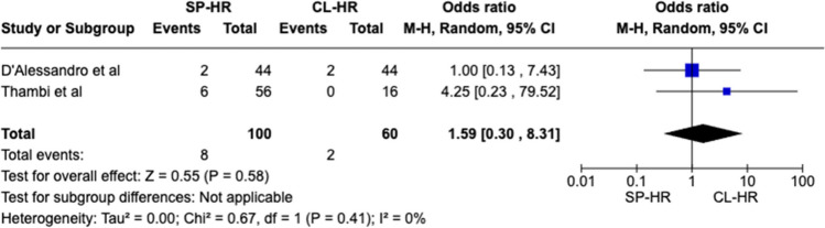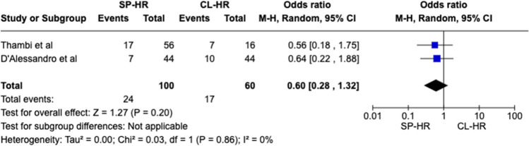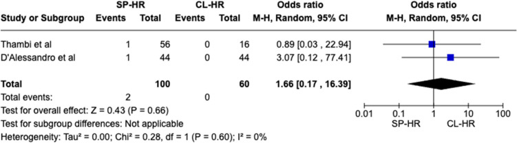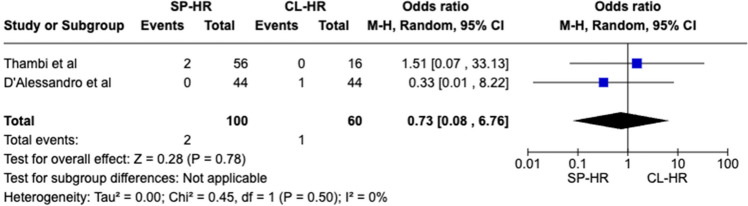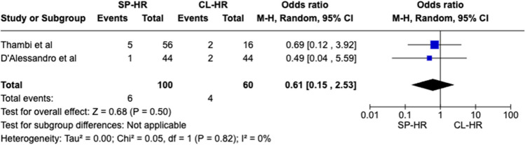 Results: Two observational studies matching our inclusion criteria with a total of 160 patients (SILS 100 vs. CL 60) were included. Statistical difference was observed for one outcome measure: operative duration (MD - 44.79 CI - 65.54- - 24.04, P < 0.0001). No significant difference was seen in mortality rate (OR 1.66 CI 0.17-16.39, P = 0.66), overall post-operative complications (OR 0.60 CI 0.28-1.32, P = 0.20), length of stay (MD - 0.22 CI - 4.25-3.82, P = 0.92), Clavien-Dindo III + complications (OR 0.61 CI 0.15-2.53, P = 0.50), risk of visceral injury (OR 1.59 CI 0.30-8.31, P = 0.58), and re-operation rates (OR 0.73 CI 0.08-6.76, P = 0.78).