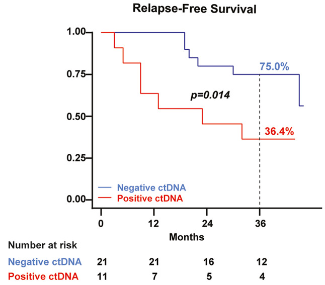 Results: Baseline ctDNA was detected in 11/32 (34.4%) patients and predicted postoperative high risk of relapse [HR 3.79, 95% CI 1.20-12.00, p = 0.023]. The three-year overall survival (OS) rate was 54.6% (95% CI 22.9-77.9) versus 95% (95% CI 69.5-99.3) in ctDNA-positive and negative groups, respectively, with significantly worse OS for ctDNA-positive patients [HR 7.92, 95% CI 1.56-40.36, p = 0.013]. Among the baseline ctDNA-positive group (high-risk patients), longitudinal ctDNA detection during adjuvant therapy reflected the clinical outcomes. Only non-relapsing patients cleared their plasma ctDNA by the end of the treatment, while persistent ctDNA detection provided early evidence of disease recurrence.