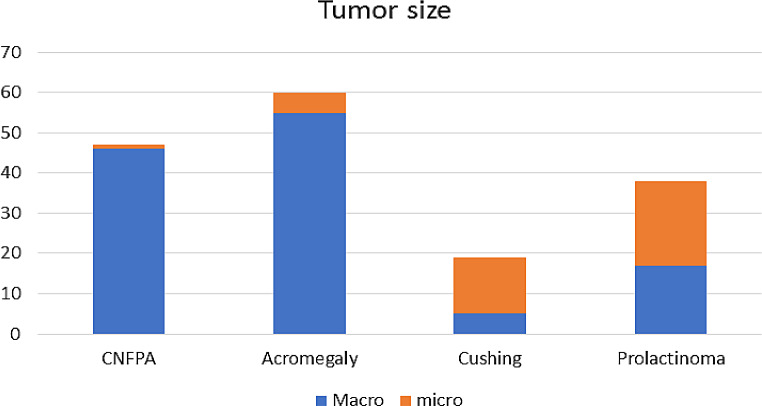 Results: A total of 200 patients with pituitary adenoma were identified. Acromegaly was the most prevalent adenoma, accounting for 35% (n = 70) of cases, followed by clinically nonfunctional pituitary adenoma (CNFPA) at 28.5% (n = 57), prolactinoma at 23% (n = 46), and Cushing disease at 13.5% (n = 27). All of the patients with Cushing disease had surgery, with trans-sphenoidal surgery accounting for 92.59%. Prolactinoma was mostly treated with medication (82.60% of cases). Post-operative complications were reported, including cerebrospinal fluid (CSF) leakage in CNFPA cases (24.13%, n = 7) and diabetes insipidus (DI) in acromegaly (13.46%, n = 7). Unfortunately, 5 patients died: two with acromegaly, two with CNFPA and one with Cushing disease.