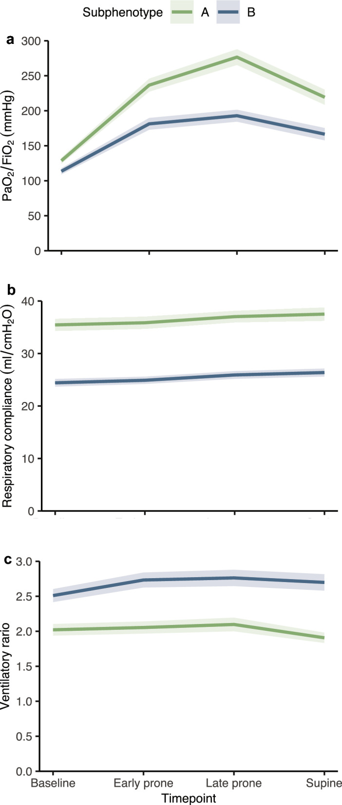 Methods: Consecutive ventilated patients with PCR-confirmed COVID-19 infection, in which prone positioning was clinically indicated for moderate or severe ARDS, were included in a prospective cohort. The patients were assigned to development or validation cohorts based on a temporal split. The PaO2/FiO2 ratio, respiratory compliance, and ventilatory ratio were assessed longitudinally throughout the first prone session. The subphenotypes were derived and validated using machine learning techniques. A K-means clustering implementation designed for joint trajectory analysis was utilized for the unsupervised classification of the development cohort. A random forest model was trained on the labeled development cohort and used to validate the subphenotypes in the validation cohort.