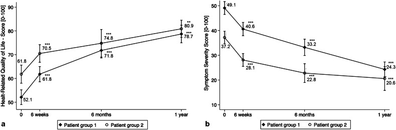 Materials and methods: This bi-center longitudinal clinical study involved the treatment of 100 patients with symptomatic uterine fibroids using USgHIFU (n = 59 in Germany, n = 41 in Bulgaria). Clinical outcomes were evaluated at 6 weeks, 6 months, and 1 year follow-up utilizing the uterine fibroid symptoms-quality of life questionnaire for fibroid-related symptoms and health-related quality of life as well as MRI imaging for determining the fibroid volume.