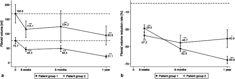 Conclusion: To our knowledge, this is the first longitudinal study conducted in two major European HIFU centers that reveals the clinical efficacy of USgHIFU ablation on symptomatic uterine fibroids. Our results confirm that USgHIFU is a non-invasive approach with a low risk of complications, offering an innovative treatment option for affected women.