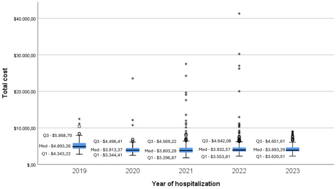 Results: The study included a total of 1408 patients who underwent MBS in four prominent hospitals in the area during the specified period. Among these patients, an average of 74.8% were female, with a mean age of 37.31 years and a mean body mass index (BMI) of 40.3 kg/m2. Furthermore, 88.9% of the patients underwent gastric bypass. Although there were few acquired complications during hospital admission there were vascular complications following infusion, transfusion, and therapeutic injection, 22.45% (n = 11), hemorrhage and hematoma complicating procedure not classified elsewhere, 8.16% (n = 4), leakage, 8.16% (n = 4), and one death during this study. There were 67 readmissions within 30 days (4,75%). The total costs incurred throughout the patient's journey, covering hospitalization and one-year post-procedure, exhibited a median value of $4,078.53. Additionally, a notable positive association was observed between post-discharge expenses and age, indicating a tendency for costs to rise as patients grow older.