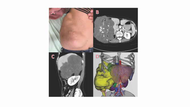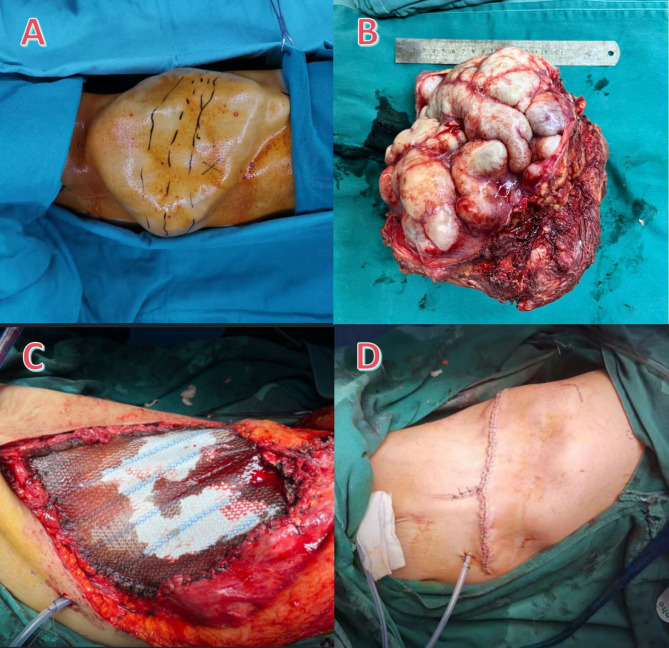 Case presentation: A 49-year-old female patient presented with progressive swelling of the right chest and abdominal wall over 15 years. Chest CT revealed a 20.1 × 15.6 × 13.7 cm multilocular cystic-solid mass with internal calcification, encircling the 8th to 12th ribs and causing elevation of the right diaphragm. Compression of the liver resulting in a significant reduction in volume. Based on an ultrasound-guided biopsy, chondrosarcoma Grade I was diagnosed. After a multi-disciplinary discussion, we performed a complete resection of the tumor, including the 8th to 12th anterolateral ribs and part of the diaphragm. The diaphragm was then reconstructed by suturing it to the ribs and intercostal muscles at the resection margin. The thoraco-abdominal wall defects were reconstructed with a polypropylene mesh. Finally, we excised the excess skin and then closed the incision. Histopathologic diagnosis was chondrosarcoma Grade II. The postoperative course was uneventful. At the 3-month postoperative follow-up, no signs of recurrence were observed.