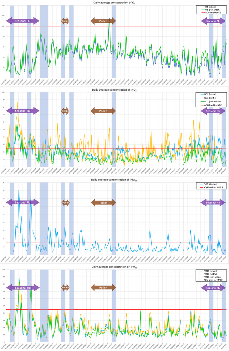 Background: Ambient air pollution is recognized as a major risk factor for chronic obstructive pulmonary disease (COPD) which is the third leading cause of death worldwide. We examined whether variations in daily outdoor air pollutants levels were associated with excess hospital emergency room visits (ERV) for acute exacerbation of COPD (AECOPD).