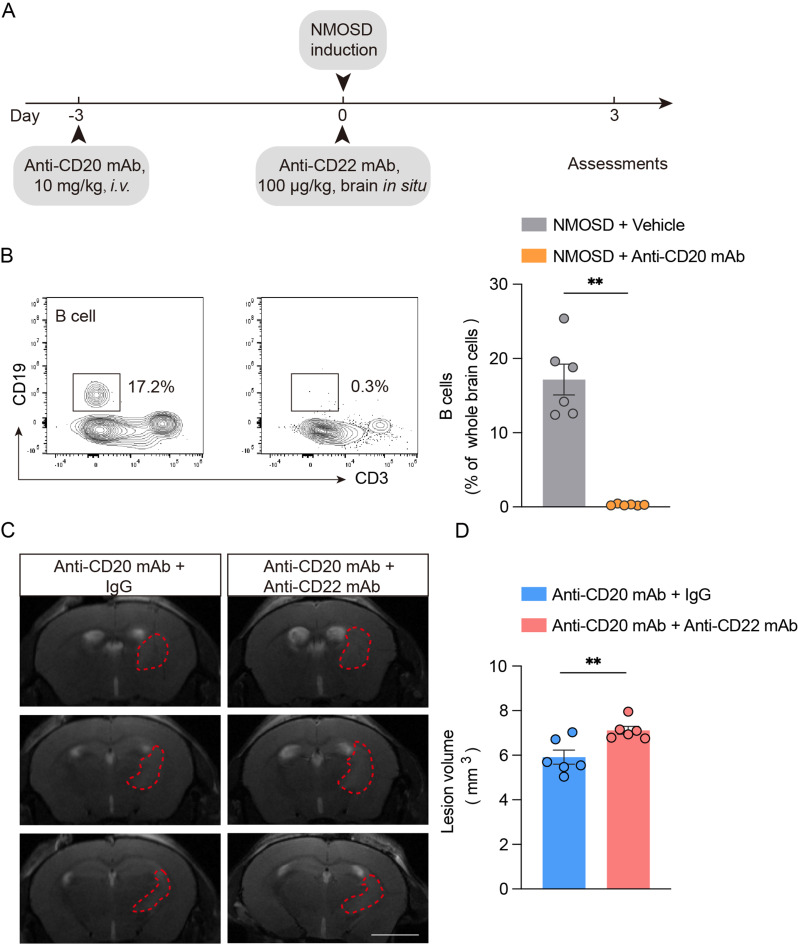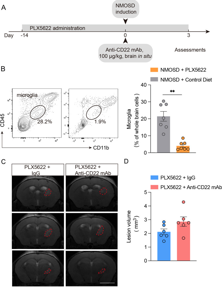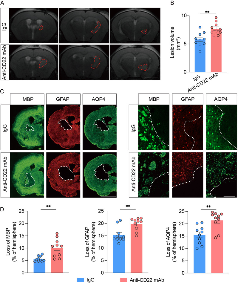 Conclusions: Our findings revealed a previously unrecognized role of CD22 as a key molecular switch that governs the detrimental effects of microglia and Gr-1+ myeloid cells in NMOSD, which paves the way for the future design of immune therapies for NMOSD.