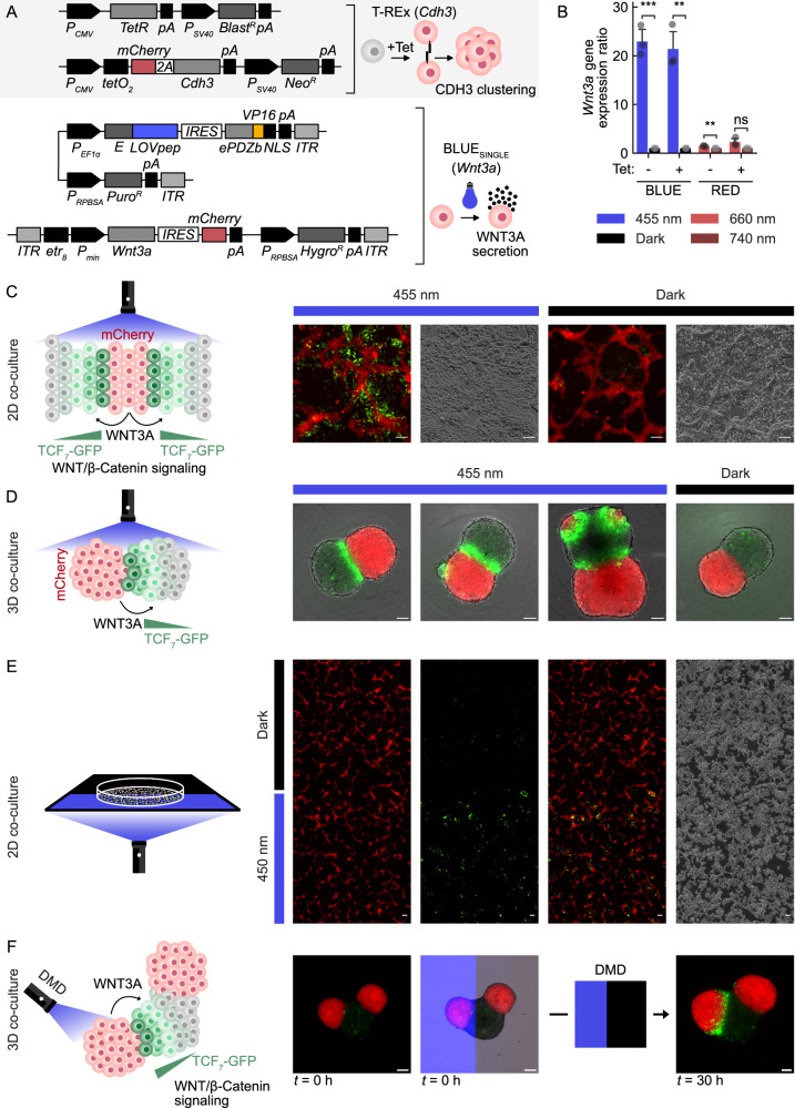 Recent advances in tissue engineering have been remarkable, yet the precise control of cellular behavior in 2D and 3D cultures remains challenging. One approach to address this limitation is to genomically engineer optogenetic control of cellular processes into tissues using gene switches that can operate with only a few genomic copies. Here, we implement blue and red light-responsive gene switches to engineer genomically stable two- and three-dimensional mammalian tissue models. Notably, we achieve precise control of cell death and morphogen-directed patterning in 2D and 3D tissues by optogenetically regulating cell necroptosis and synthetic WNT3A signaling at high spatiotemporal resolution. This is accomplished using custom-built patterned LED systems, including digital mirrors and photomasks, as well as laser techniques. These advancements demonstrate the capability of precise spatiotemporal modulation in tissue engineering and open up new avenues for developing programmable 3D tissue and organ models, with significant implications for biomedical research and therapeutic applications.