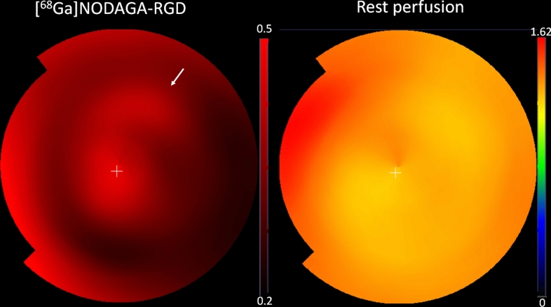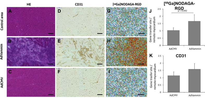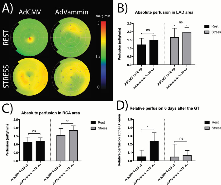 This preliminary study investigated if VEGFR-2 selective adenoviral Vammin (AdVammin) gene therapy could induce angiogenesis and increase perfusion in the healthy porcine myocardium. Also, we determined using a clinically relevant large animal model if AdVammin gene therapy could improve the function of a chronically ischemic heart. Low doses of AdVammin (dose range 2 × 109-2 × 1010 vp) gene transfers were performed into the porcine myocardium using an endovascular injection catheter. AdCMV was used as a control. The porcine model of chronic myocardial ischemia was used in the ischemic studies. The AdVammin enlarged the mean capillary area and stimulated pericyte coverage in the target area 6 days after the gene transfers. Using positron emission tomography 15O-radiowater imaging, we demonstrated that AdVammin gene therapy increased perfusion in healthy myocardium at rest. AdVammin treatment also increased ejection fraction at stress in the ischemic heart, as detected using left ventricular cine angiography. In addition, we demonstrated successful in vivo imaging of enhanced angiogenesis using [68Ga]NODAGA-RGD peptide. However, AdVammin also increased tissue permeability and was associated with significant pericardial fluid accumulation, limiting AdVammin's therapeutic potential and emphasizing the importance of correct dosage.