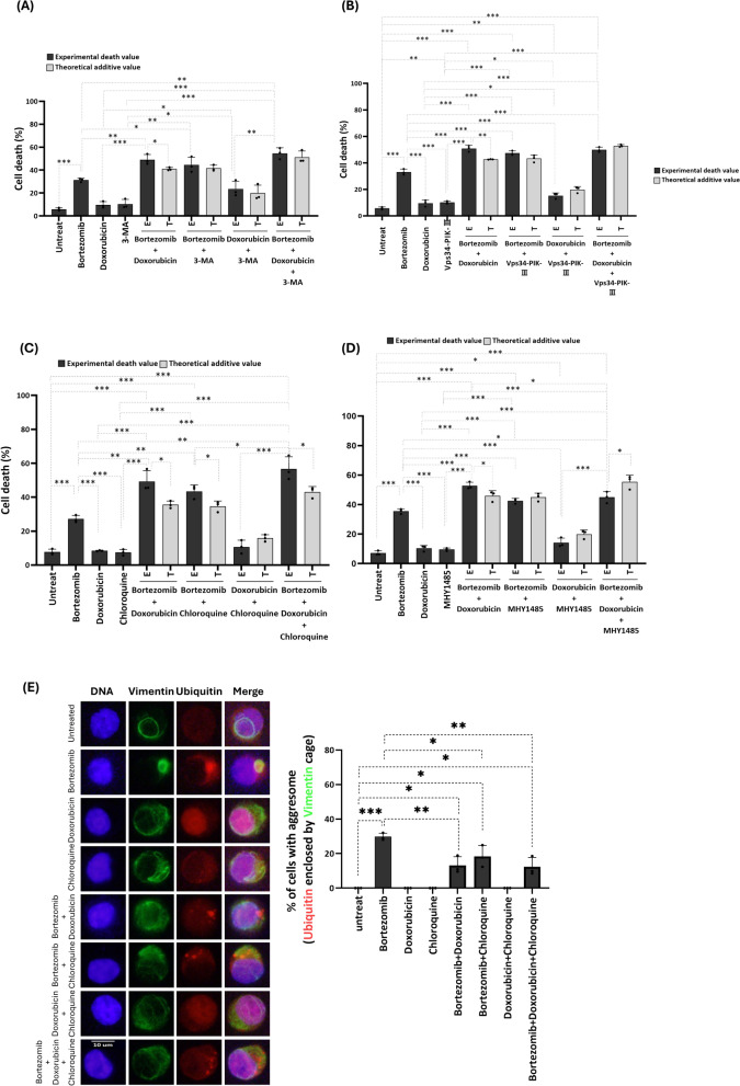 Results: Doxorubicin enhanced bortezomib-induced cytotoxicity while inhibiting aggresome formation. Mechanistic studies revealed that doxorubicin downregulated key aggresome components, including Vimentin, HDAC6, and Dynein, leading to accumulation of misfolded proteins and augmentation of proapoptotic and necroptotic pathways by intensifying endoplasmic reticulum (ER) and Golgi stress responses. Notably, doxorubicin did not enhance cell death triggered by proteasome inhibitors that do not induce aggresome formation. Furthermore, the combination of bortezomib and doxorubicin failed to produce synergy in the killing of MM cell lines that lacked aggresome-forming ability.