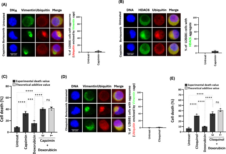 Background: Bortezomib is a standard treatment for multiple myeloma (MM), working by the accumulation of toxic misfolded proteins in cancer cells. However, a significant clinical challenge arises from the development of resistance to bortezomib in MM treatment. Aggresome, a subcellular structure enclosed within Vimentin, forms in response to proteasome inhibitors and sequesters misfolded proteins that are transported by histone deacetylase 6 (HDAC6) and Dynein for degradation via autophagy, thereby reducing bortezomib's cytotoxic effects. Therefore, in this study, we screened several anticancer agents to identify those that could synergize with bortezomib to enhance cell death and block aggresome formation in the MM cell line U266B1.