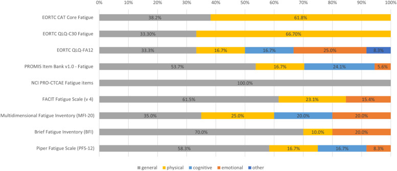 Comparing the contents of patient-reported outcome measures for fatigue: EORTC CAT Core, EORTC QLQ-C30, EORTC QLQ-FA12, FACIT, PRO-CTCAE, PROMIS, Brief Fatigue Inventory, Multidimensional Fatigue Inventory, and Piper Fatigue Scale