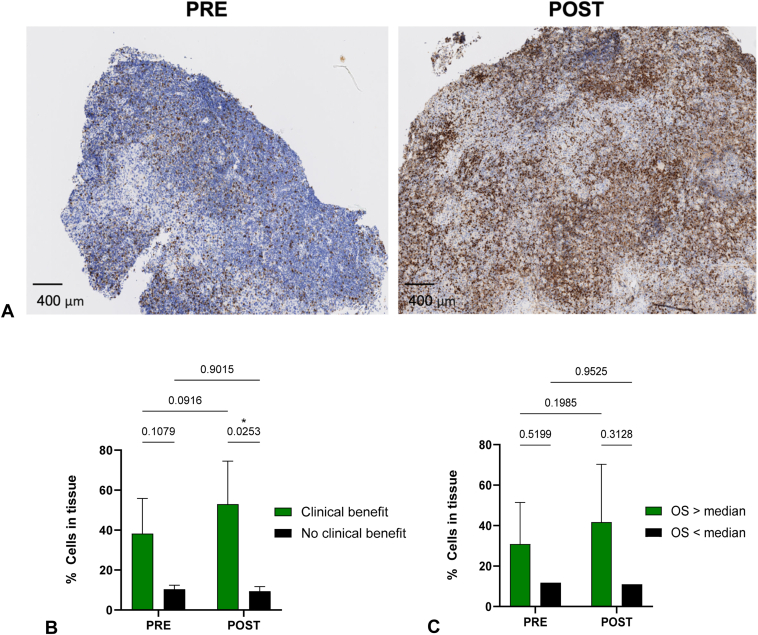 Results: Eight patients were enrolled. Two patients achieved a partial response, yielding an objective response rate of 25%. Median progression-free survival and overall survival were 3.8 and 13.0 months, respectively. The cryoactivation procedure was well tolerated, without grade 3 to 4 adverse events. Post-hoc analysis reported a CB rate of 50%. Immunohistochemistry analysis reported a numerical difference in the cluster of differentiation 8-positive (CD8+) T cell infiltration in CB versus NCB in the pre- and post-treatment biopsies (p = 0.09) and an increase in CD8+ T cells in the post-treatment biopsies of CB versus NCB (p = 0.03).