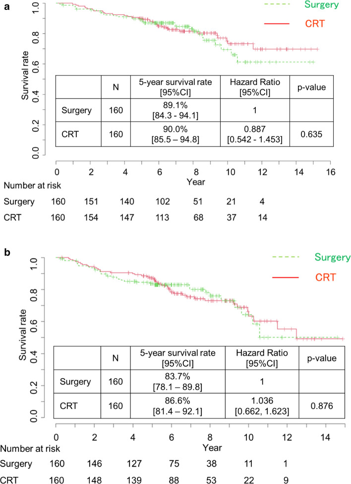 Methods: This was a multicenter, retrospective study conducted at 65 hospitals in Japan. The inclusion criteria were patients with ESCC who underwent ER between January 2006 and December 2015, with pT1a-muscularis mucosa (MM) with LVI or pT1b, with negative vertical margins, cN0M0, and who underwent surgery or CRT. A 1:1 propensity score-matched analysis was performed between two groups. The primary and secondary end points were overall survival (OS) and relapse-free survival (RFS). OS and RFS were also compared between two subgroups: low risk (pT1a-MM with LVI and pT1b without LVI) and high risk (pT1b with LVI) for metastatic recurrence.