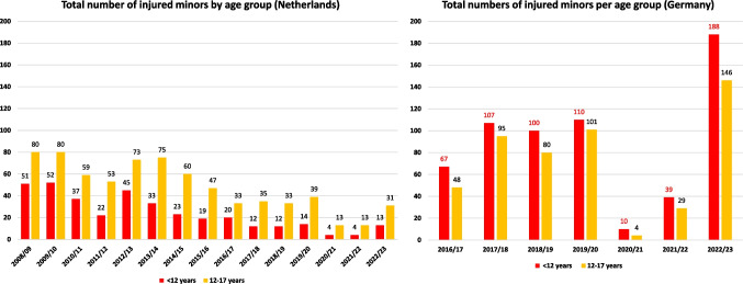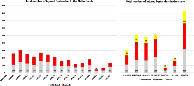 Results: Around New Year ́s Eve 2022/23 the number of patients with firework inflicted eye injuries increased in the Netherlands to 133 and in Germany to 838. In both countries the participation of eye departments was 90%. The incidence of firework induced eye injuries in the Netherlands was 0,8 /100 000 in 2022/23, in Germany 1,0 /100 000 in 2022/23. Comparing age groups of minors with firework induced eye injuries, in the Netherlands, total numbers of children below 12 years was lower than total numbers of adolescents between 12 and 17 years. Yet, in Germany from 2016 on every year, total number of children below 12 years were higher than total number of adolescents. The number of patients who reported on being injured as bystander was between 34% in 2020/21 and 53% in both countries.