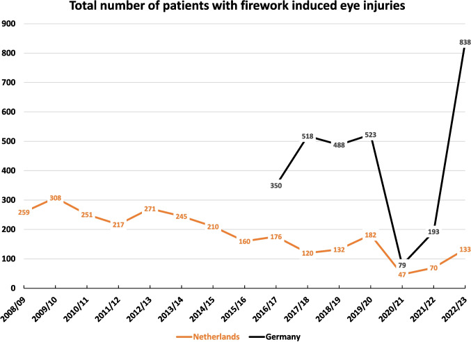 Key messages: What is known: overrepresentation of affected minors below 18 years and a rate of up to 50% of injured bystanders according to our data collection over 15 years in the Netherlands and 7 years in Germany What is new: In 2022/2023, total numbers of patients with fire work induced eye injuries in the Netherlands and Germany increased significantly after 2 years of pandemic regulations with a sales ban of consumer fire work articles In 2022/23, incidence of firework induced eye injuries is 1/100 000 in Germany, 0,8/100 000 in the Netherlands Among affected minors in Germany school children up to 12 years are at higher risk than adolescents.