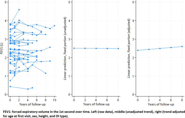 Conclusions: An increase of FEV1 and FVC over time was observed in OI patients after adjustment for other variables, suggesting that the defective collagen synthesis may impact the pulmonary interstitium and lead to increased lung compliance and hyperinflation, in contrast to skeletal deformities, which reduce the thoracic volume. Lung function changes in OI thus result from the interplay of several mechanisms.