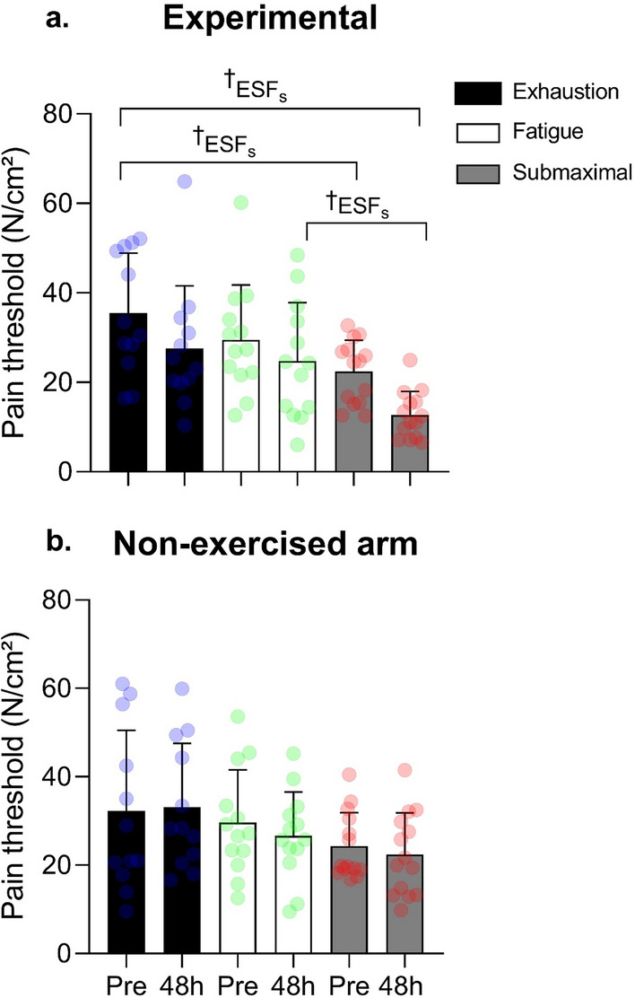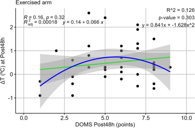 It remains unclear whether exercises leading to different outcomes of delayed onset muscle soreness (DOMS) may also elicit different skin temperature responses. The aim of this study was to determine whether different intensities and volumes of a single-joint exercise influence the DOMS and skin temperature measurements differently in healthy adults. Thirty-nine men and women were randomly assigned to three groups performing different exercise of different intensities and volumes (Exhaustion, Fatigue, Submaximal) to induce DOMS in the biceps brachii. DOMS (numeric pain rate scale, NPRS), pressure pain threshold (PPT) and skin temperature (infrared thermography, IRT) were measured on exercise day and 48 h later. The different exercises resulted in lower PPT responses 48 h after exercise and different DOMS reported across the different groups. Skin temperature outcomes did not differ following the different protocols. We found an increased minimum skin temperature 48 h after exercise in groups performing more intense exercises, but such differences were found in both exercised and non-exercised arms. Differently of PPT outcomes, pain reported depended on exercise intensity, and skin temperature 48 h after exercise could not show acute exercise adaptations. Skin temperature responses are contingent upon the characteristics of the participants rather than exercise intensity.