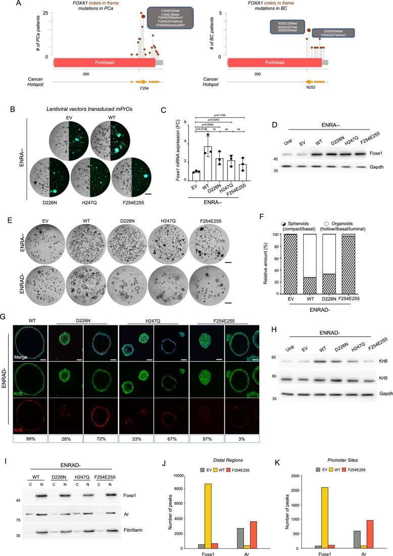 Retinoic acid (RA) signaling is a master regulator of vertebrate development with crucial roles in body axis orientation and tissue differentiation, including in the reproductive system. However, a mechanistic understanding of how RA signaling governs cell lineage identity is often missing. Here, leveraging prostate organoid technology, we show that RA signaling orchestrates the commitment of adult mouse prostate progenitors to glandular identity, epithelial barrier integrity, and specification of prostatic lumen. RA-dependent RARγ activation promotes the expression of Foxa1, which synergizes with the androgen pathway for luminal expansion, cytoarchitecture and function. FOXA1 mutations are common in prostate and breast cancers, though their pathogenic mechanism is incompletely understood. Combining functional genetics with structural modeling of FOXA1 folding and chromatin binding analyses, we discover that FOXA1F254E255 is a loss-of-function mutation compromising its transcriptional function and luminal fate commitment of prostate progenitors. Overall, we define RA as an instructive signal for glandular identity in adult prostate progenitors. Importantly, we identify cancer-associated FOXA1 indels affecting residue F254 as loss-of-function mutations promoting dedifferentiation of adult prostate progenitors.