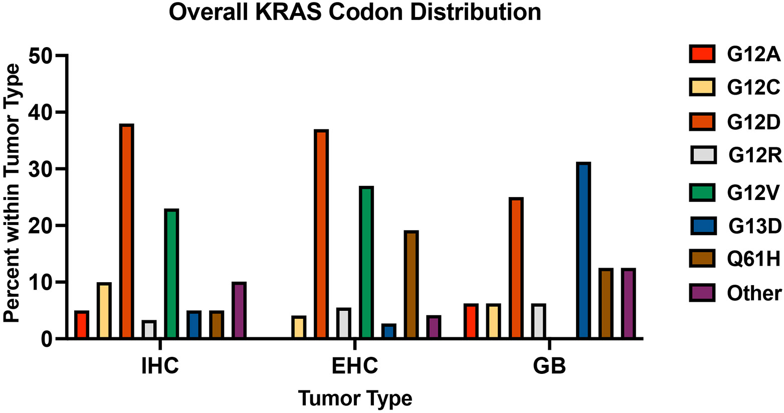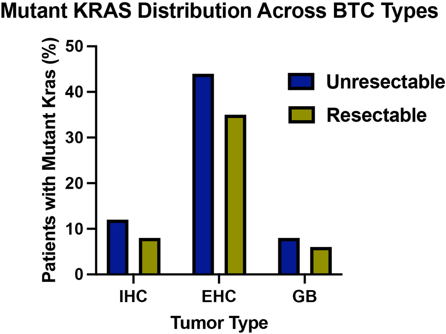 Conclusion: The adverse impact of KRAS mutations in BTC is driven by G12 alterations in patients with IHC regardless of resection status, which was not observed in GB or EHC. There are unique comutational partners in distinct BTC subsets. These differences have important clinical implications in the era of KRAS-targeted therapeutics.