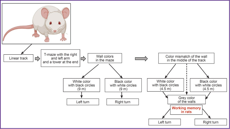 The aim of the study is to develop an experimental method to effectively assess the working memory in rats. The method uses a state-of-the-art controlled virtual environment with a virtual maze. The setup includes a treadmill for rodents, a fixation system, a dome for displaying virtual environment, and a control unit.