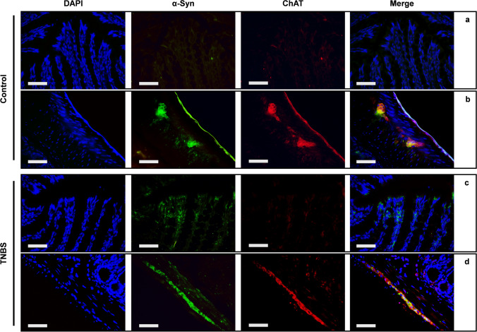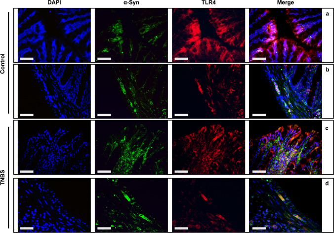 Alpha-synuclein (α-syn) is widely expressed in presynaptic neuron terminals, and its structural alterations play an important role in the pathogenesis of Parkinson's disease (PD). Aggregated α-syn has been found in brain, in the peripheral nerves of the enteric nervous system (ENS) and in the intestinal neuroendocrine cells during synucleinopathies and inflammatory bowel disorders. In the present study, we evaluated the histomorphological features of murine colon with 2,4,6-trinitrobenzene sulfonic acid (TNBS)-induced colitis, a common model of colitis. Thereafter, we investigated the expression of α-syn, Toll-like receptor 4 (TLR4), choline acetyltransferase (ChAT), vasoactive intestinal peptide (VIP), tyrosine hydroxylase (TH), calcitonin gene-related peptide (CGRP), and calcitonin-like receptor (CALCR). Finally, we investigated the presence of phosphorylated α-syn (pS129 α-syn) aggregates and their relationship with inflammatory cells. Colon from TNBS mice showed an increase in inflammatory cells infiltrate and significative changes in the architecture of the intestinal mucosa. α-Syn expression was significantly higher in inflamed colon. VIP was increased in both the mucosa and muscularis externa of TNBS mice, while TH, CGRP, and CALCR were significantly reduced in TNBS mice. Amyloid aggregates of pS129 α-syn were detectable in the ENS, as in the macrophages around the glands of the mucosa correlating with the markers of inflammation. This study describes - for the first time - the altered expression of α-syn and the occurrence of amyloid α-syn aggregates in the inflammatory cells under colitis, supporting the critical role of bowel inflammation in synucleinopathies and the involvement of α-syn in IBD.