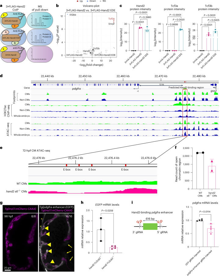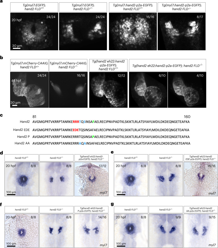 The basic helix-loop-helix transcription factor HAND2 has multiple roles during vertebrate organogenesis, including cardiogenesis. However, much remains to be uncovered about its mechanism of action. Here, we show the generation of several hand2 mutant alleles in zebrafish and demonstrate that dimerization-deficient mutants display the null phenotype but DNA-binding-deficient mutants do not. Rescue experiments with Hand2 variants using a newly identified hand2 enhancer confirmed these observations. To identify Hand2 effectors critical for cardiogenesis, we analyzed the transcriptomes of hand2 loss- and gain-of-function embryonic cardiomyocytes and tested the function of eight candidate genes in vivo; pdgfra was most effective in rescuing myocardial migration in hand2 mutants. Accordingly, we identified a putative Hand2-binding region in the zebrafish pdgfra locus that is important for its expression. In addition, Hand2 loss- and gain-of-function experiments in mouse embryonic stem cell-derived cardiac cells decreased and increased Pdgfra expression, respectively. Altogether, these results further our mechanistic understanding of HAND2 function during early cardiogenesis.