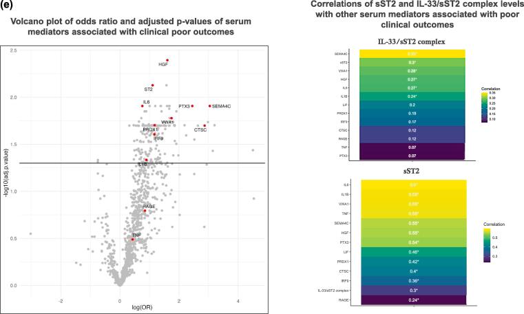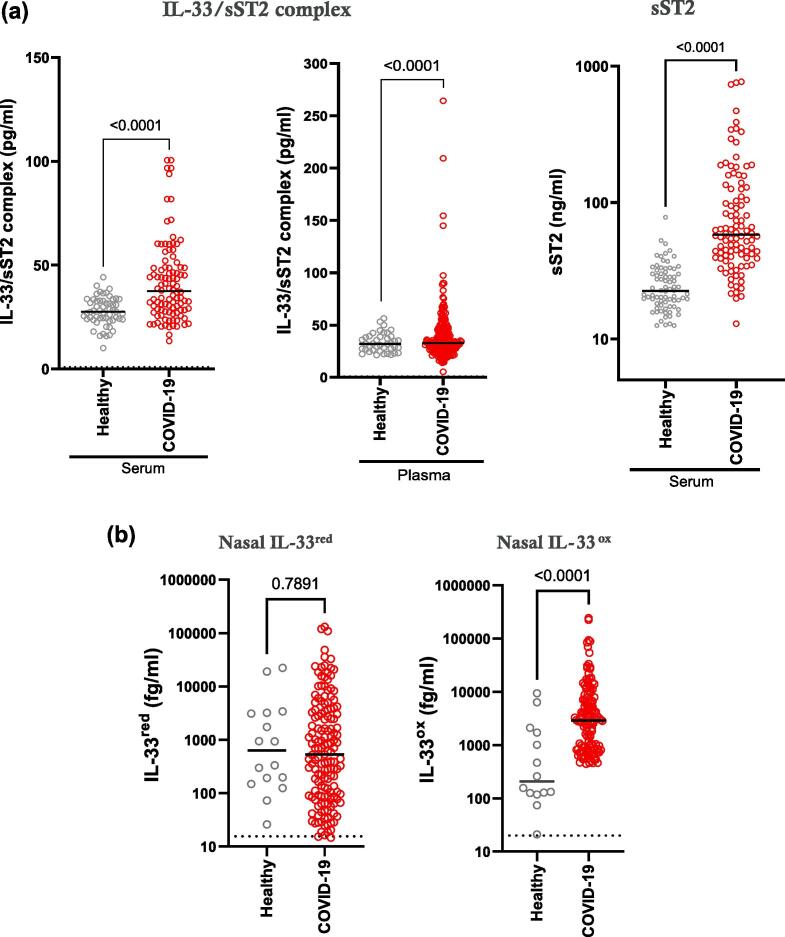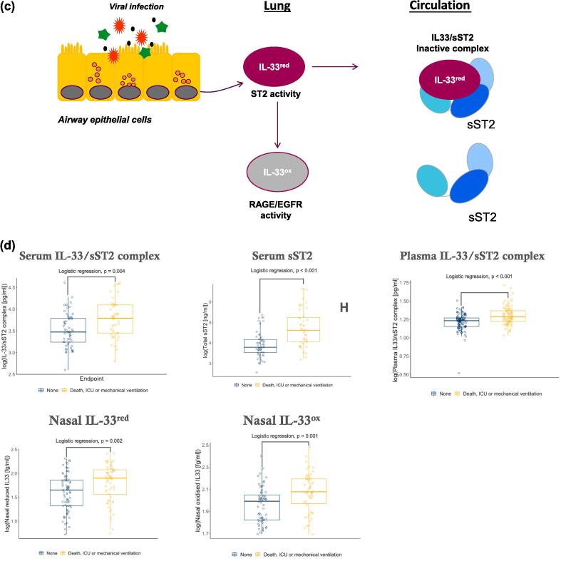 Interleukin (IL)-33 is released following tissue damage, causing airway inflammation and remodelling via reduced IL-33 (IL-33red)/serum stimulation-2 (ST2) and oxidised IL-33 (IL-33ox)/receptor for advanced glycation end products (RAGE)/epidermal growth factor receptor (EGFR) pathways. This study aimed to identify associations of IL-33 with clinical outcomes and pathological mechanisms during viral lower respiratory tract disease (LRTD). Ultra-sensitive immunoassays were developed to measure IL-33red, IL-33ox and IL-33/sST2 complexes in samples from patients hospitalised with COVID-19. Immunohistochemistry and multiomics were used to characterise lung samples. Elevated IL-33 in the airway and IL-33/sST2 complex in the circulation correlated with poor clinical outcomes (death, need for intensive care or mechanical ventilation). IL-33 was localised to airway epithelial and endothelial barriers, whereas IL1RL1 was expressed on aerocytes, alveolar endothelial cells specialised for gaseous exchange. IL-33 increased expression of mediators of neutrophilic inflammation, immune cell infiltration, interferon signalling and coagulation in endothelial cell cultures. Endothelial IL-33 signatures were strongly related with signatures associated with viral LRTD. Increased IL-33 release following respiratory viral infections is associated with poor clinical outcomes and might contribute to alveolar dysfunction. Although this does not show a causal relationship with disease, these results provide a rationale to evaluate pathological roles for IL-33 in viral LRTD.