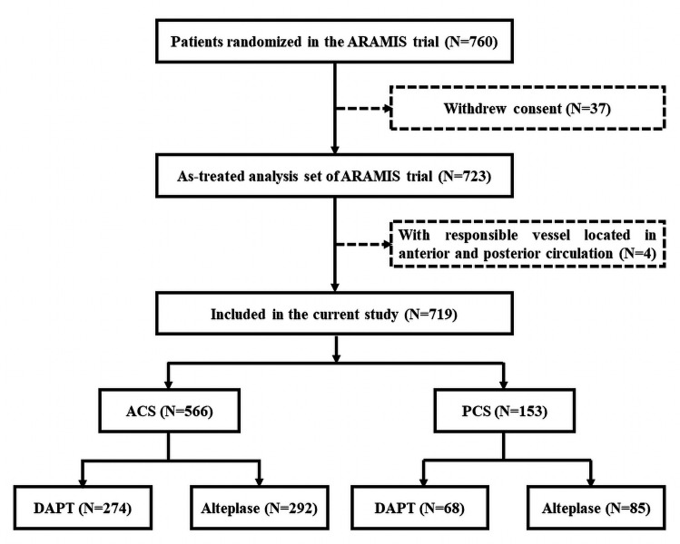Methods: Participants were divided according to stroke territory, which were subdivided into DAPT and alteplase. An excellent functional outcome at 90 days defined as modified Rankin Scale scoring 0-1 was primary outcome. National Institutes of Health Stroke Scale (NIHSS) score change and early neurological improvement measured by a 2-point decline in NIHSS score at 24 hours were secondary outcomes. Symptomatic intracerebral haemorrhage (sICH) and bleeding events were safety outcomes. Primary analyses adjusted unbalanced baseline characteristics between treatments by multivariate logistic regression.