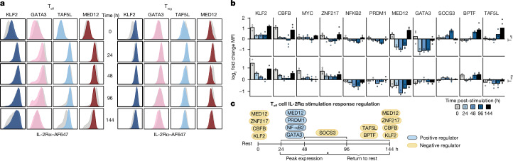 The ability of cells to maintain distinct identities and respond to transient environmental signals requires tightly controlled regulation of gene networks1-3. These dynamic regulatory circuits that respond to extracellular cues in primary human cells remain poorly defined. The need for context-dependent regulation is prominent in T cells, where distinct lineages must respond to diverse signals to mount effective immune responses and maintain homeostasis4-8. Here we performed CRISPR screens in multiple primary human CD4+ T cell contexts to identify regulators that control expression of IL-2Rα, a canonical marker of T cell activation transiently expressed by pro-inflammatory effector T cells and constitutively expressed by anti-inflammatory regulatory T cells where it is required for fitness9-11. Approximately 90% of identified regulators of IL-2Rα had effects that varied across cell types and/or stimulation states, including a subset that even had opposite effects across conditions. Using single-cell transcriptomics after pooled perturbation of context-specific screen hits, we characterized specific factors as regulators of overall rest or activation and constructed state-specific regulatory networks. MED12 - a component of the Mediator complex - serves as a dynamic orchestrator of key regulators, controlling expression of distinct sets of regulators in different T cell contexts. Immunoprecipitation-mass spectrometry revealed that MED12 interacts with the histone methylating COMPASS complex. MED12 was required for histone methylation and expression of genes encoding key context-specific regulators, including the rest maintenance factor KLF2 and the versatile regulator MYC. CRISPR ablation of MED12 blunted the cell-state transitions between rest and activation and protected from activation-induced cell death. Overall, this work leverages CRISPR screens performed across conditions to define dynamic gene circuits required to establish resting and activated T cell states.