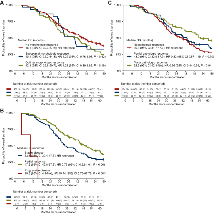 Results: In the overall population, suboptimal [hazard ratio (HR) 1.10, 95% confidence interval (CI) 0.83-1.47] and optimal (HR 0.95, 95% CI 0.74-1.22) morphologic response were not associated with OS compared with no response. RECIST partial response (HR 0.61, 95% CI 0.49-0.76) and progressive disease (HR 5.77, 95% CI 3.97-8.39) were associated with OS compared with stable disease. In 242 patients who underwent local treatment, suboptimal (HR 1.22, 95% CI 0.76-1.96) and optimal (HR 1.28, 95% CI 0.89-1.86) morphologic response were not associated with OS compared with no response. RECIST partial response was not significantly associated with OS (HR 0.73, 95% CI 0.52-1.01), whereas progressive disease was (HR 19.74, 95% CI 5.75-67.78), compared with stable disease. While major pathological response (HR 0.66, 95% CI 0.44-0.99) was associated with OS, partial pathological response (HR 0.82, 95% CI 0.57-1.19) was not, compared with no pathological response. Pathological response, but not morphologic response and RECIST, was significantly associated with early recurrence (P < 0.001) which occurred in 13/58 (22%) patients with major response, 29/61 (48%) patients with partial response, and 51/88 (58%) patients with no response.