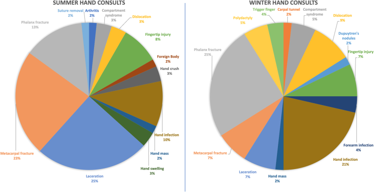 Methods: This is a retrospective review of hand consults for the plastic surgery service over summer and winter intervals at a Level I trauma center. Consults were triaged with non-plastic surgery residents managing consults through remote direction of a plastic surgery resident. Demographic, clinical and outcomes data were analyzed to make inferences regarding care.
