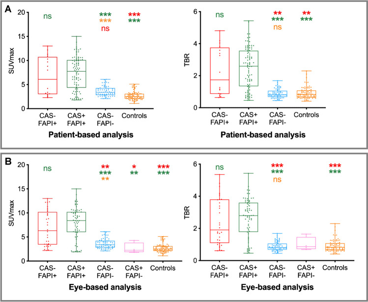 Results: Eye-based analysis included 42 TED eyes and 20 control eyes. SUVmax did not differ significantly between CAS-/FAPI + (n = 8) and CAS + /FAPI + (n = 17) eyes; though both groups had significantly higher SUVmax than CAS-/FAPI- (n = 16), CAS + /FAPI- (n = 1), and control eyes (n = 20) (all P < .05). Diffuse high FAPI uptake with excellent TBR was observed in pathologically active EOMs and had higher SUVmax and TBR than inactive EOMs (SUVmax: 9.57 ± 2.79 vs. 4.04 ± 1.02, TBR: 2.99 ± 1.00 vs. 1.00 ± 0.35, both P < .001). An SUVmax cutoff value of 5.95 yielded an area under the receiver operating characteristic curve of 0.98 for predicting active disease. Sensitivity and specificity of CAS-driven and FAPI-driven assessments for TED activity were 72.7% and 100%, 100% and 100%, respectively. SUVmax positively correlated with pathological fibroinflammatory score (r = 0.68, P = .004).