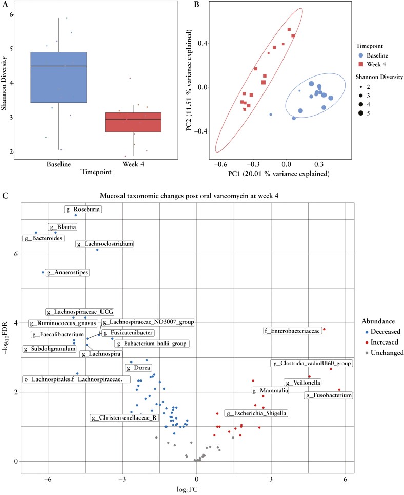 Results: Oral vancomycin resulted in clinical remission in 12/15 patients and significant reductions in fecal calprotectin. Oral vancomycin was associated with reduced abundances of Lachnospiraceae, genera Blautia and Bacteroides; and enrichment of Enterobacteriaceae, and genera Veillonella, Akkermansia, and Escherichia. Oral vancomycin treatment was associated with the downregulation of multiple metatranscriptomic pathways (including short-chain fatty acid [SCFA] metabolism and bile acid [BA] biotransformation), along with host genes and multiple pathways involved in inflammatory responses and antimicrobial defence; and an upregulation of genes associated with extracellular matrix repair. Oral vancomycin use resulted in the loss of specific fecal SCFAs and secondary BAs, including lithocholic acid derivatives. Colitis activity relapsed following OV withdrawal, with host mucosal and microbial changes trending toward baseline.