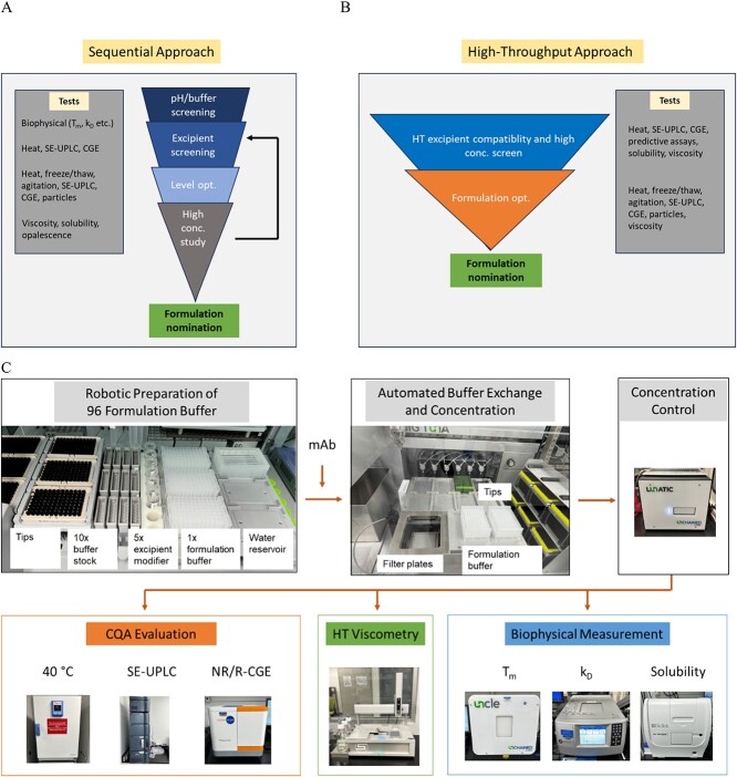 Background: Formulation screening is essential to experimentally balance stability and viscosity in high-concentration mAb formulations. We developed a high-throughput approach with automated sample preparation and analytical workflows to enable the integrated assessment of excipient compatibility and viscosity of mAb formulations.